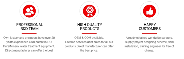 A tecnologia de osmose reversa é usada para purificar a água, que é a tecnologia de separação por membrana mais avançada e eficaz do mundo. É para separar o material que não pode passar através da membrana semi-permeável da água quando a pressão é superior à pressão osmótica da solução. O orifício da membrana RO é tão pequeno que pode remover sal dissolvido, colóide, sólido suspenso e microrganismo etc. O sistema é de boa qualidade da água, baixo consumo de energia, sem poluição, tecnologia simples e controle fácil.
