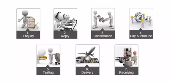 A: envie o inquérito --- obter a cotação --- aprovar a ordem --- fazer o PI --- pagamento --- organizar a produção e informar --- descansar e relaxar --- inspeção de produtos acabados --- fazer o saldo --- organizar entrega --- bens recebidos.